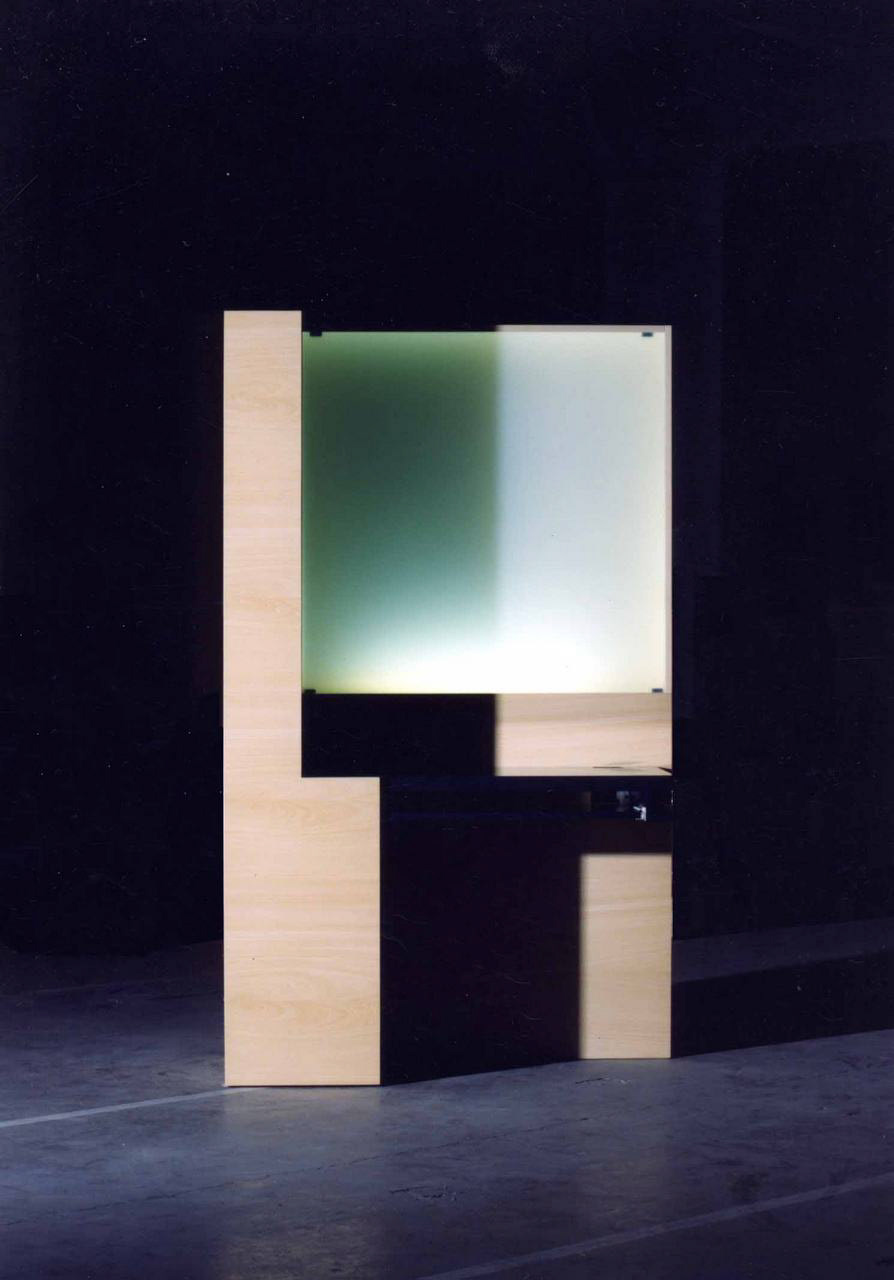 Stolek pro pracovní stanici. V zavíracím sloupu prostor pro počítač a příslušenství. Za pracovní plochou osvětlení skrz skleněnou desku.