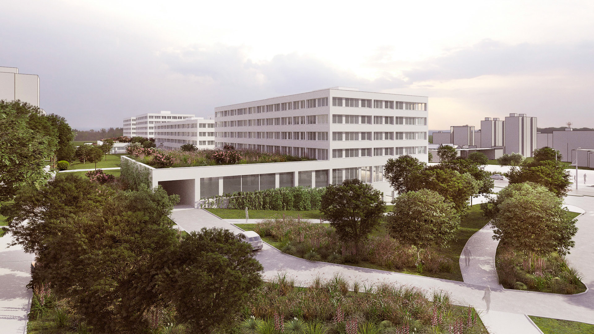 Zábradlí terasy má přes celou šířku vestavný květináč, který umožní osázení visící zelení. Stejný prvek je použit i u lemu vjezdové rampy.